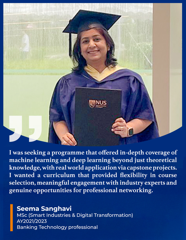 The NUS MSc (Smart Industries & Digital Transformation) programme stood out with its emphasis on AI, data science and digital transformation in smart industries. Its modular structure also allowed me to earn a graduate certificate along the way, giving me the opportunity to pace my learning based on other commitments.