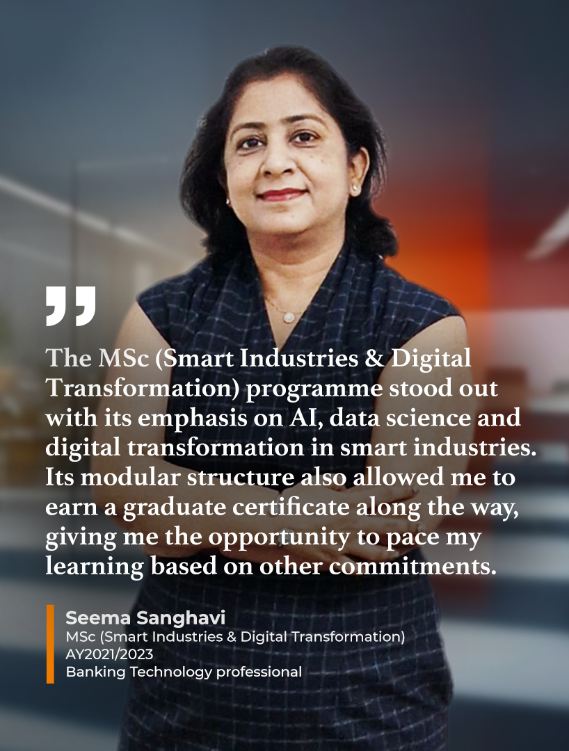 Today we have the pleasure of sharing an article contributed by Seema Sanghavi. A graduate of the Master of Science (MSc) (Smart Industries and Digital Transformation), Seema is a twenty-year veteran of the banking technology sector who took up the programme in 2021 to — in her own words — “get aboard the AI train”.